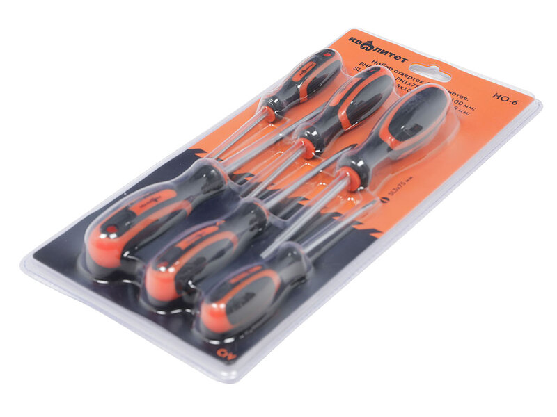 Набор отверток КВАЛИТЕТ (6 шт) - инструмент, подходящий для монтажных, слесарных, столярных работ. Набор включает в себя как шлицевые, так и крестовые отвертки: PH0*75MM, PH1*75MM, PH2*100MM, SL3*75MM, SL5*100MM, SL6*125MM