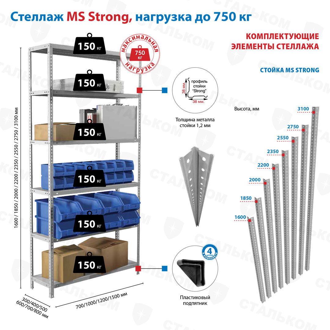 Купить стеллаж MS Strong 2750х1200х400, 6 полок в Набережных Челнах с доставкой